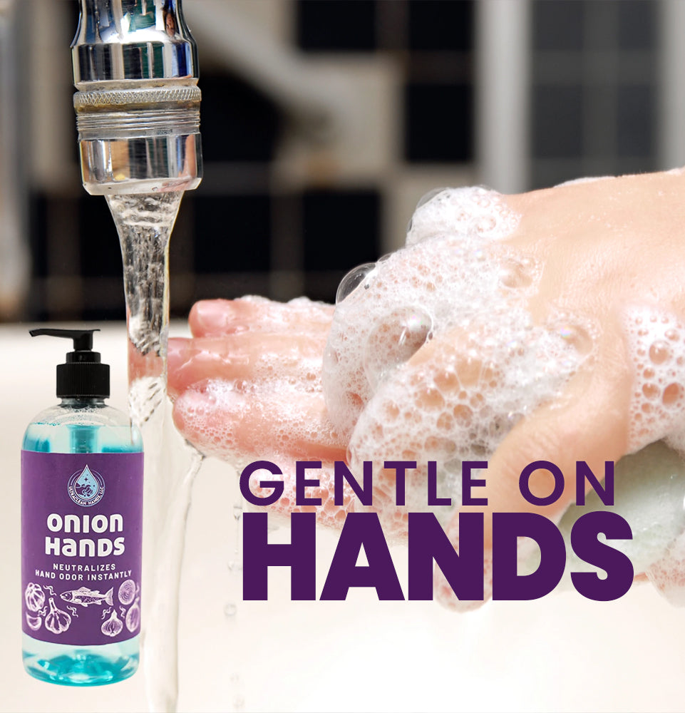 - Unlike conventional soaps, ONION HANDS® neutralizes complex scent compounds, targeting food-related hand odors such as strong spices, garlic, onions and fish - as well as bleach, pet messes, and topical medications.
